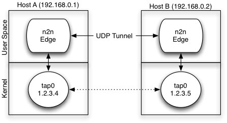 边缘节点通过虚拟tap进行通信。每个tap接口都是一个n2n边缘节点。每台PC可以具有多个tap结构,每个n2n网络一个,因此同一台PC可以属于多个社区。